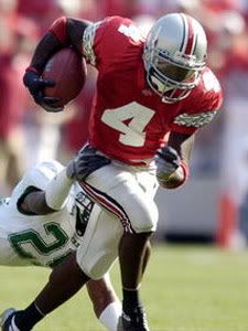 After a successful Pro Day on 3/9, Holmes secured his position as the top receiver in the draft. His size is marginal at 5'10", 179; but, his game is huge. Santonio ran a blazing time of 4.34 in the 40-yard dash. Perhaps more impressive is his game-time attitude. Holmes seems to possess a killer instinct on the field. His ball skills are incredible, his route-running is never compromised, and he is always willing to sacrifice his body to aid when blocking. He finishes every play: a testament to his excellent attitude. "I'm the guy that's hard-working and willing to do whatever it takes for the team's sake."