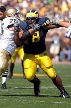 With a year or two to groom behind Ted Washington, Haloti Ngata can be a pro bowler in the NFL. At 6'4"/338, Ngata has ideal size to play the nose tackle position in the 3-4. He can take on two blockers better than any defensive tackle prospect to enter the draft in recent memory. In addition, Ngata has the requisite athleticism to get to the quarterback as a pass rusher. His blend of size and speed is truly rare. An elite prospect, Ngata would have the Browns pinching themselves on draft day if he made it to #12. A legitimate option to be swiped up by the Bills at #8 and the Radiers at #7, Ngata is simply a beast in the middle. He is the ideal guy for the Browns to grab.