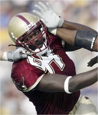 It is no secret that the Broncos pursued John Abraham this off-season. Finding a pass rusher would help their defensive line substantially. Mathias Kiwanuka has been slipping down draft boards since the end of the college season this fall. Originally considered a prospect capable of cracking the top ten, Kiwanuka is now lost in the shuffle among some dynamic defensive ends in this draft class. Nevertheless, Kiwanuka was a force at Boston College. He is a pure pass rusher that is just what the Broncos desire. His 6'6"/256 size is excellent. He is simply a physical specimen. A team leader on the field, he has all the intangibles to be great. His productive career will be something not easily forgotten by the Browns management since they are targetting a premier pass rusher.